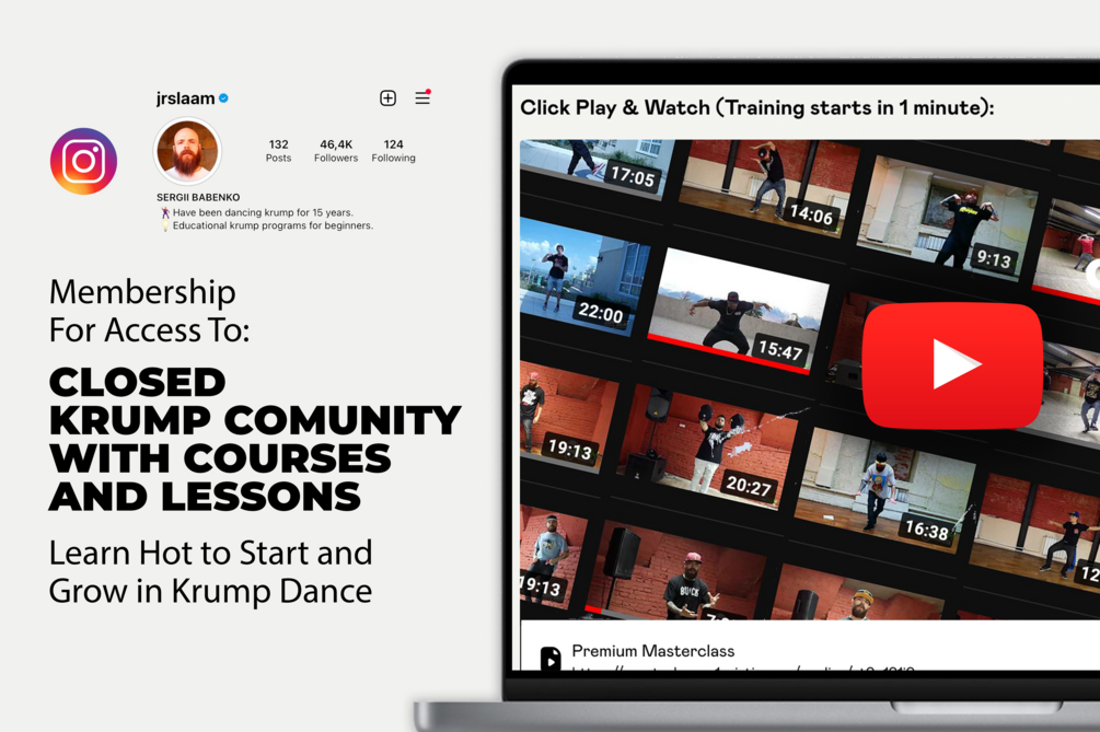 • Step-by-Step Plan to Start Krump in 30 Days: Follow our comprehensive recorded video course, consisting of 20 lessons and bonuses, designed to guide you through your krump journey from novice to pro in just one month.
